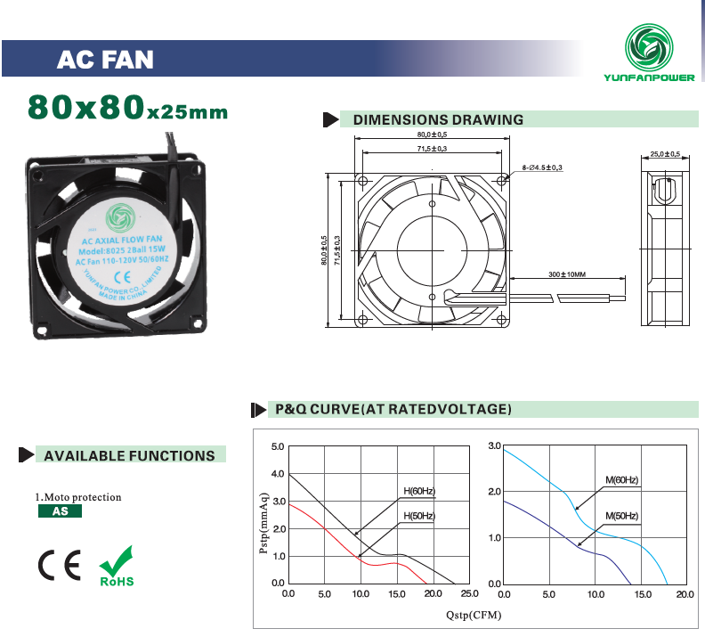 | YFA8025S1H | 100-125 | 50/60 | 0.11/0.10 | 2300/2700 | 0.54/0.65 | 2.9/4.0 | 36/38 | ||